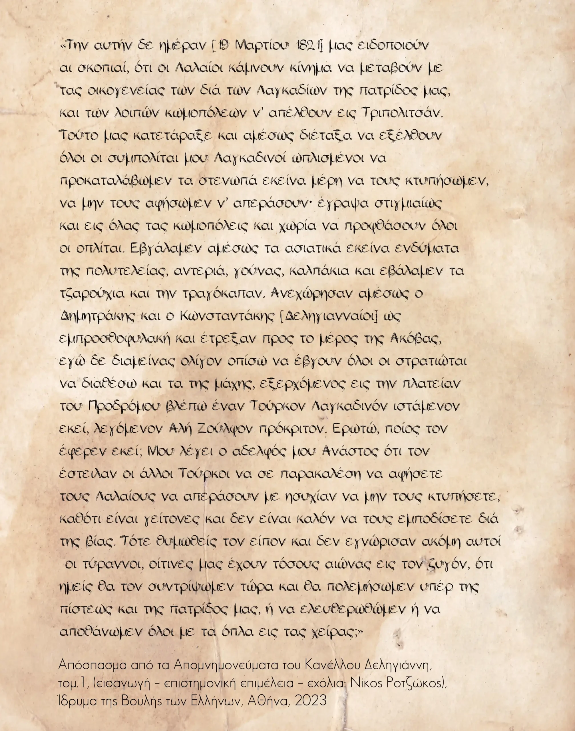 “Ο Κανέλλος Δεληγιάννης γεννήθηκε στις 14 Φεβρουαρίου 1780 στα Λαγκάδια Γορτυνίας και ήταν ο τέταρτος υιός του Ιωάννη Παπαγιαννόπουλου «Μωραγιάννη», ενός από τους ισχυρότερους προεστούς της Πελοποννήσου. Φοίτησε στην Σχολή της Δημητσάνας και έμαθε τα πρώτα γράμματα κοντά στον επίσκοπο Ακόβου, Δανιήλ. Στις 12 Φεβρουαρίου 1816 οι Οθωμανοί διέταξαν τον αποκεφαλισμό του πατέρα του. Στις 10 Σεπτεμβρίου 1819 ο Κανέλλος Δεληγιάννης μυήθηκε στη Φιλική Εταιρία στην Τριπολιτσά από τον Παναγιώτη Αρβάλη.